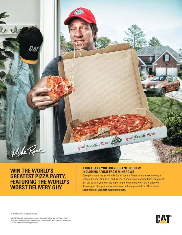 You could win a Pizza Party with Caterpillar spokesperson Mike Rowe, host of A&E’s Dirty Jobs. Snack on that.